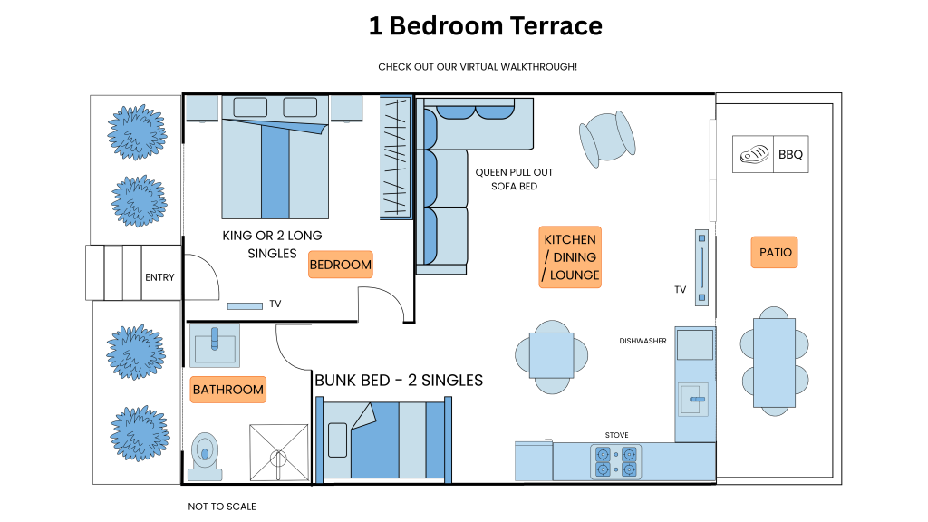 Sleeps up to 3 Adults and 1 Child. A King Bed (or alternatively 2 Long Singles) and 2 single bunk beds all in the same room. The fully equipped kitchen with air con., microwave & full fridge, TV, Own bathroom.