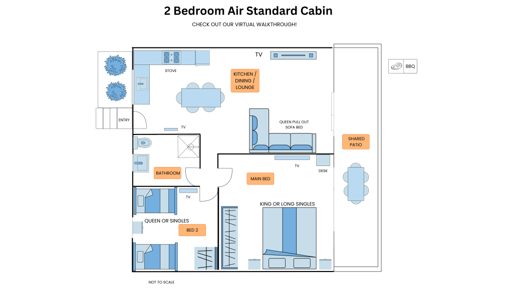 Sleeps up to 4 Adults and 2 Children. This cabin contains a fully equipped kitchen with microwave and full fridge, flat screen TV in lounge room and flat screen TV in bedroom and own bathroom.