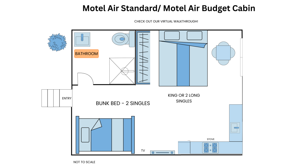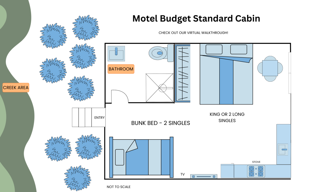 (Please note: Our Budget Cabins do provide great value and a comfortable stay, but they are located adjacent to the creek in the back corner of the park, they don't open up to a grassed family recreation area, they don't have a dedicated parking spot directly in front of the cabin, and they don't have a coffee machine. Our Motel King Cabins do include all of these features.)